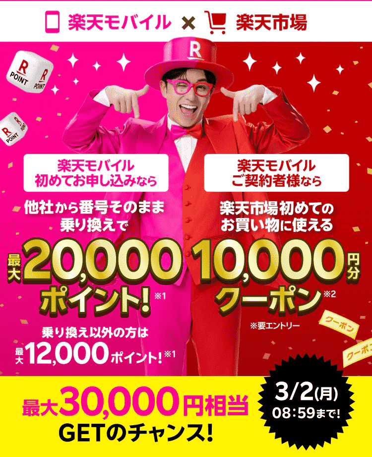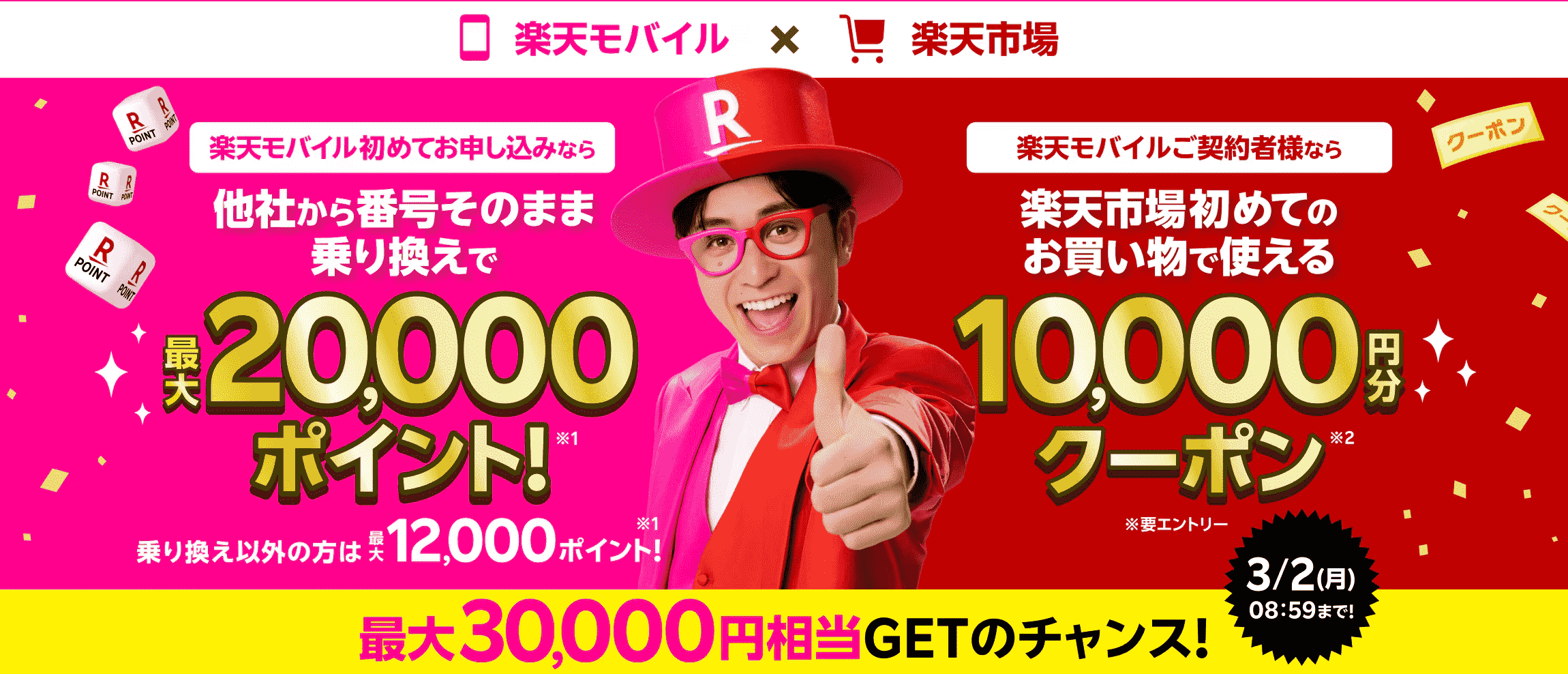 楽天モバイル×楽天市場キャンペーンの期限は、2026年3月2日(月)の8:59までです。