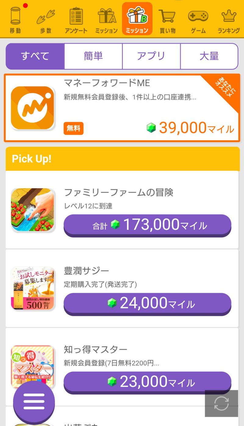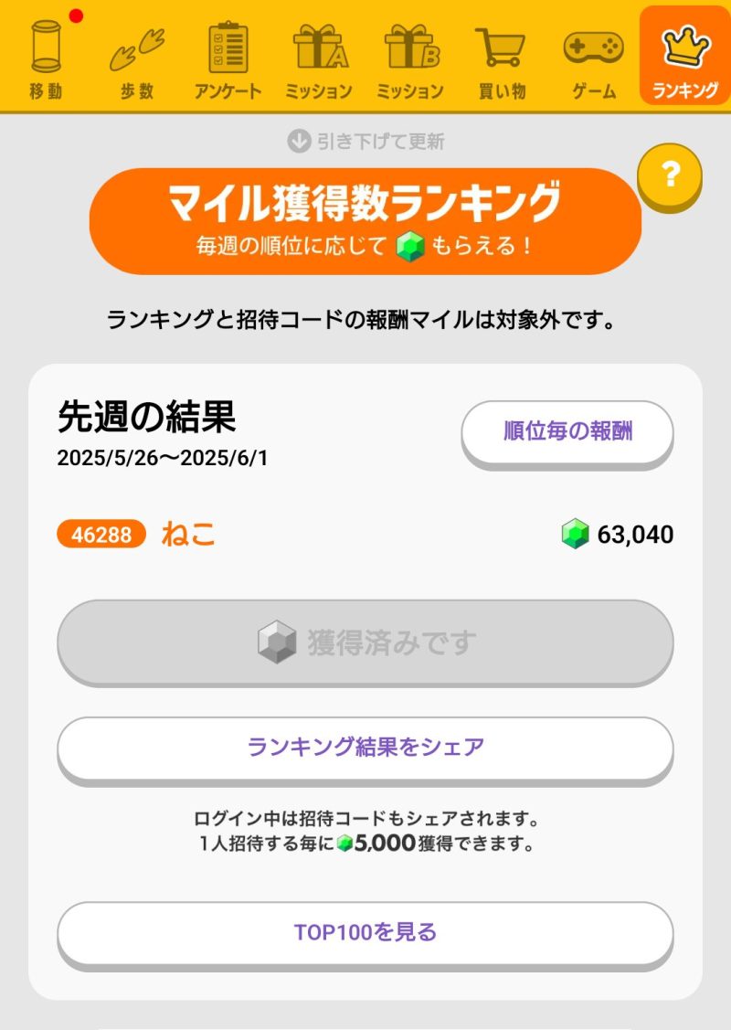 参考として、移動+歩数+ガチャの最大は1週間で9.5万マイルです。