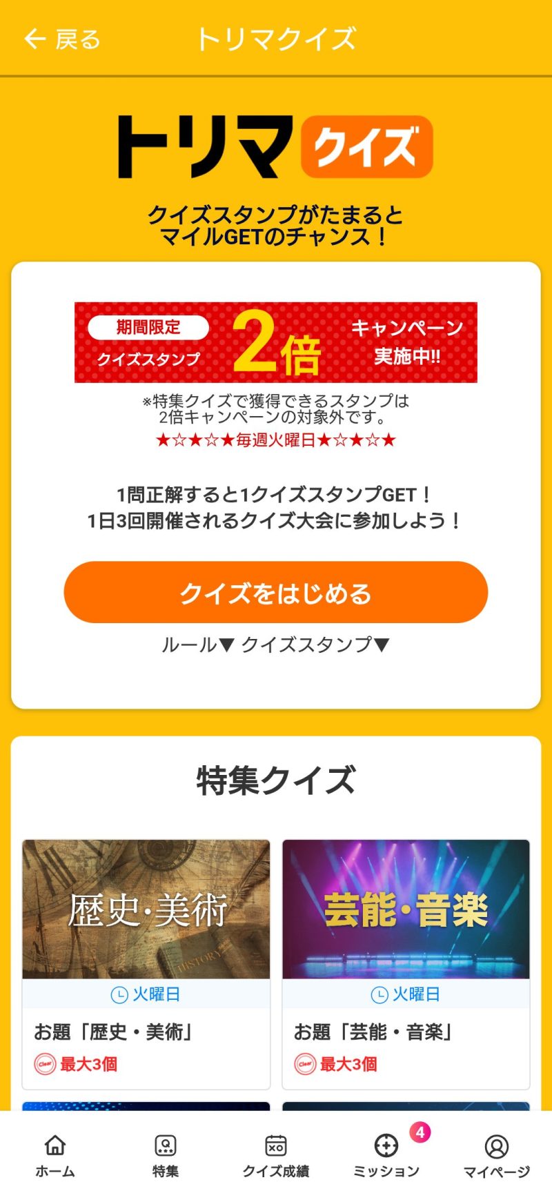1問正解で1スタンプ、1回3問、1日3回開催しています。