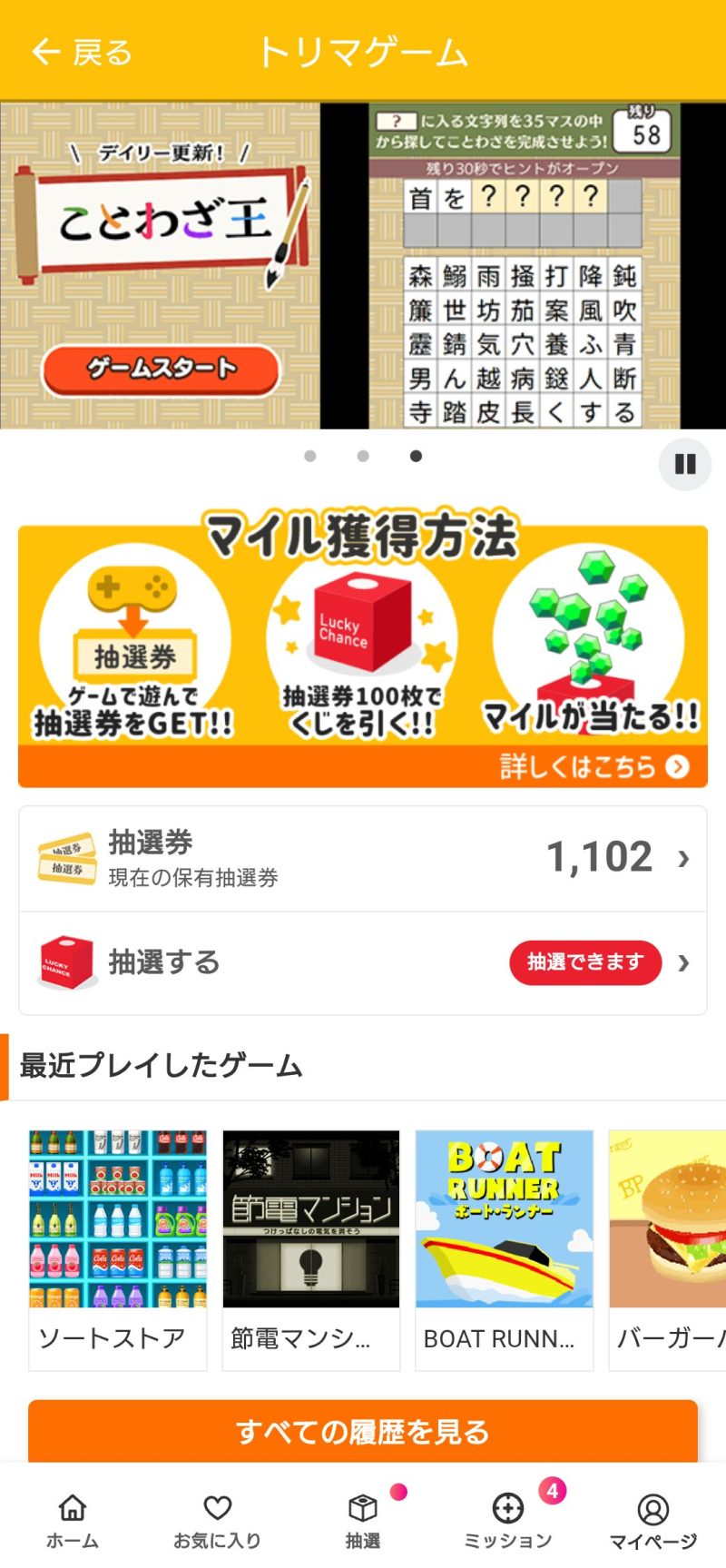 デイリーミッションがあり、特定のゲームで合計で指定スコア獲得、指定枚数の抽選券獲得、指定回数プレイ、その3つの内2個のミッションをクリアする条件があります。それぞれ20枚ずつ抽選券を獲得できます。