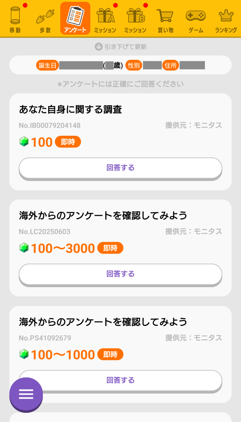たくさん答えることで配信されるアンケートが増えるので、時間があるときにオススメです。